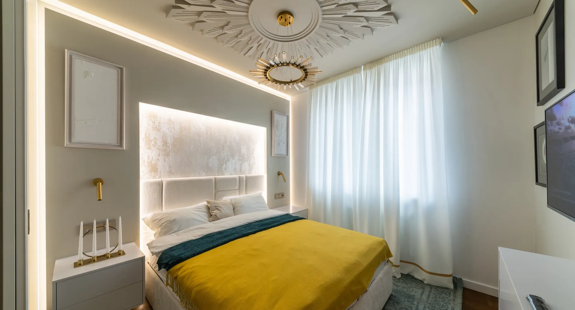 • Светодиодная лента Лента светодиодная 12V 4,8W 60Led 2835 IP65 теплый белый, 5м — её установили за изголовьем кровати, чтобы подчеркнуть уникальные текстуры стен и создать прямоугольные формы, намекающие на сочетание мужского и женского начал .
