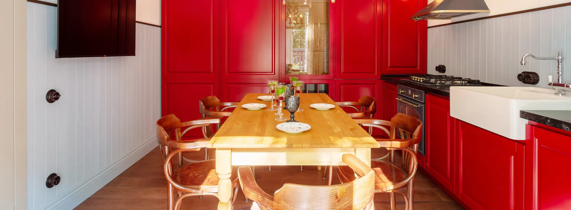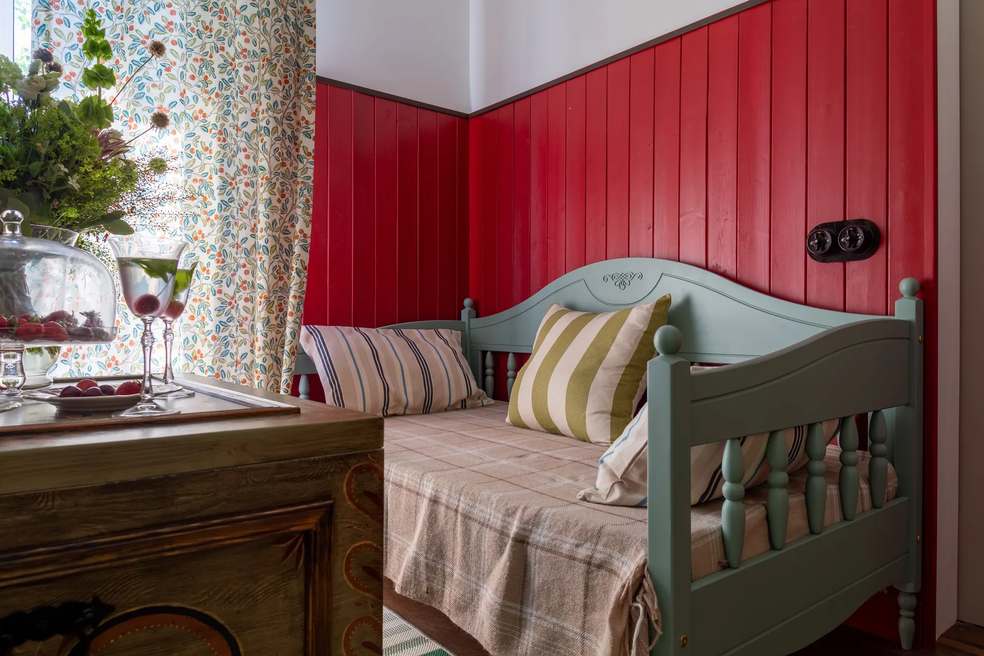 Кухня-гостиная была оформлена в нордическом густавианском стиле, который идеально подходит для наших дач средней полосы. Кухонный гарнитур насыщенного оттенка стал центральным элементом пространства. Стены отделали широкой вагонкой на две трети высоты и покрасили в спокойные тона. Для контраста добавили брутальные предметы мебели, которые придали интерьеру характер и уют.