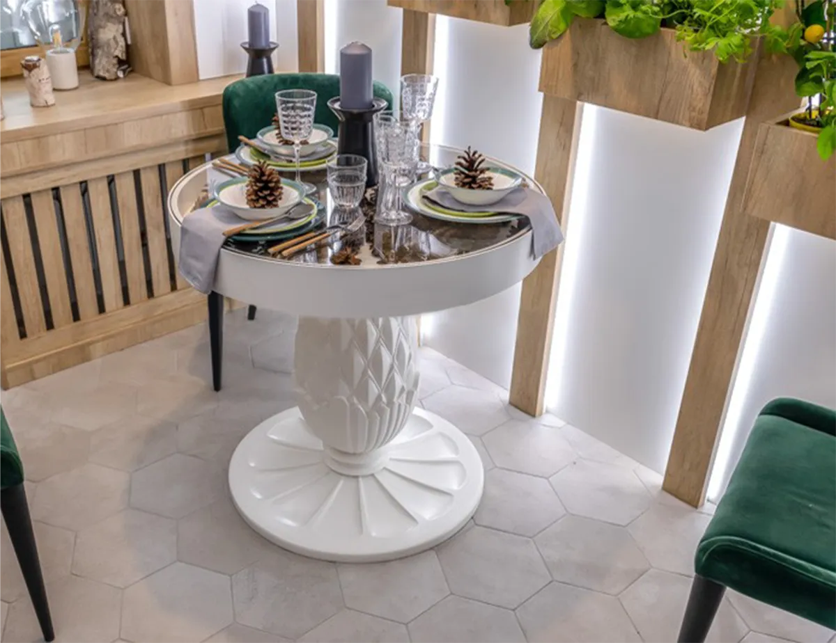 Изюминкой интерьера стал круглый стол с оригинальной ножкой в виде сосновой шишки. А главным помощником в создании волшебного освещения стала светодиодная лента 5050/60 LED Elektrostandard™ с теплым белым светом. Лента обладает повышенной яркостью, малой температурой нагрева и низким энергопотреблением . Ультраяркие светодиоды создали равномерный заливающий свет, который наполнил помещение уютом и подчеркнул сказочную атмосферу леса .