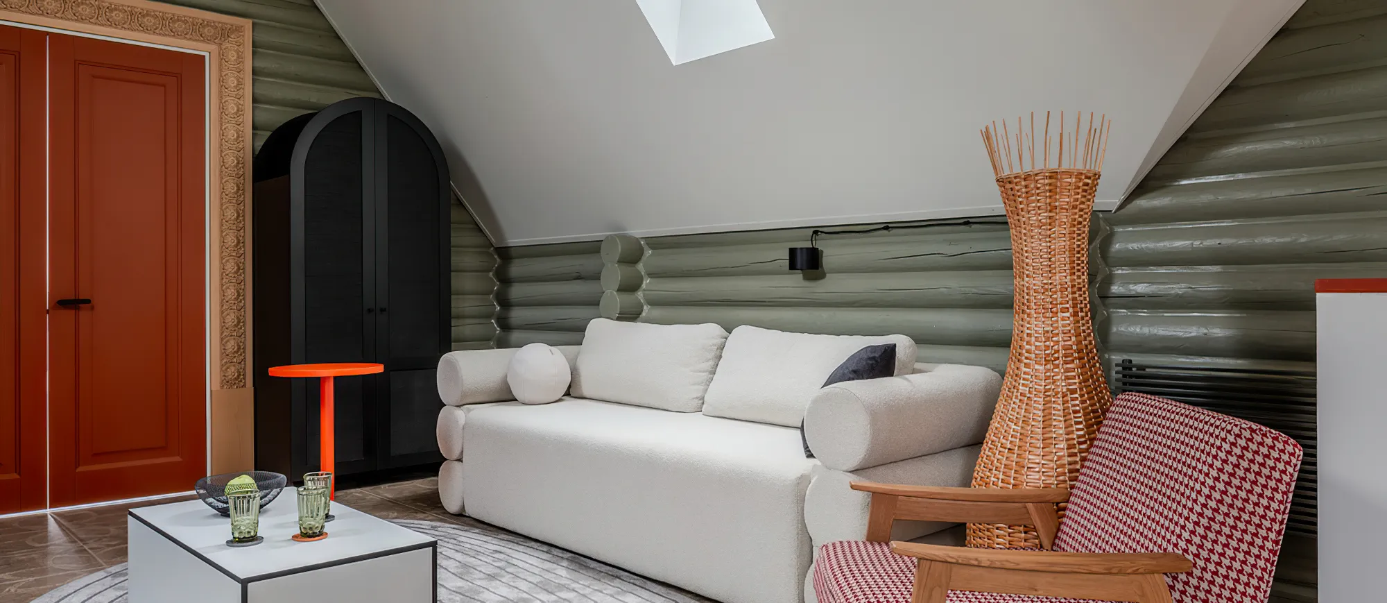 Стены из бруса получили яркую интерпретацию, добавляя пространству динамики и теплоты. Появилась уютная диванная зона, а камин с телевизором был интегрирован в конструкцию, напоминающую русскую печь с завалинкой. Этот необычный микс традиций и современности создал уникальную атмосферу, где каждая деталь напоминает о деревенском уюте, но с современным подходом .